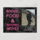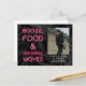 A cool and casual save the date, with neon pink style sign saying, booze, food & bad dance moves on black palm tree leaves tropical background. add one of your favorite photo.