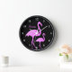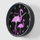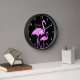 Neon pink flamingo wall clock with custom name. Personalized wall decor with trendy tropical bird design. Fun gift idea for flamingo lover / collector. Perfect for business, club, cafe, bar, restaurant, kitchen, office space, hall etc. Black or white wood trim. Big 10 inch size round clocks.
