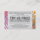 Our Zebra Print Business Coupon Cards are a fabulous, affordable way to drum up new business for your store. Use our zebra print coupon template to create coupons for free products or services, discounts towards future purchases, reduced or free admission, free gift offers -- and just about anything else you can think of!
