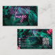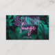 Add your name and contact info to this modern skincare/beautician business card, featuring tropical dark green foliage. The words "Skin" and "lounge" are in purple and pink neon typography with your name underneath it, and your contact details on the back of the card. There's a QR code as well, where you can add your social media URL. Contact the designer if you would like a different color on the neon text.