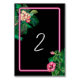 A modern yet retro themed neon pink tropical botanicals on a black background. A beautiful wedding design ideal for summer. Perfect neon pink tropical plants design featuring palm trees, pink Hibiscus flowers and Plumerias Frangipanis flowers. Black, pink, and green colors dominate this tropical pink neon design. The modern calligraphy typography contrast perfectly against the black and pink wedding themed design. A classy elegant wedding table number card design with modern simple elements. Matching wedding stationery items and other wedding invite formats are also available. Customize the number and purchase each tables number individually according to how many table numbers you need.