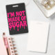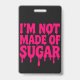 Stand tall. Speak bold. This vertical badge features the striking quote “I’M NOT MADE OF SUGAR” in neon pink drip lettering over a pure black background. Designed for maximum impact, it’s the perfect choice for those who don’t back down — whether you're heading up a panel, running the show backstage, or simply refusing to be underestimated at your next event.
