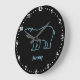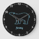 Fun wall clock features "neon" polar bear outline and customizable blue text on black background with white clock face.