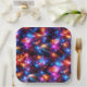Vibrant neon abstract polygon shapes bursting with explosive sparks on a striking black background.