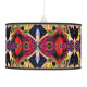 The shade on this lamp features a colorful, complex, kaleidoscopic design that resembles psychedelic neon lighting.