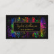 This elegant and glamorous business card features neon rainbow brush strokes with paint splatters on a black background. The text combines handwritten script and modern sans serif fonts for a classy and sophisticated look. This is perfect for make up artists, beauticians, spas, fashion stylists, interior design and more.