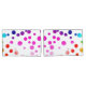 Neon rainbow polka dot pattern on a white background.