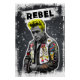 A gritty pop-art portrait of a classic 50s-style rebel in a leather jacket, set against a splattered monochrome backdrop with a bold REBEL stencil. Electric yellow hair and a jacket packed with comic-style stickers, icons, and patches fuse vintage cool with street-art energy—a striking statement for modern walls.