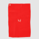 Golf towel with neon red (ff0000 ) solid color background and white font .Simple and trendy design by Alma Wad .Personalize it with your monogram now . This color is often associated with the zodiac Aries . You can consider this when choosing a gift .