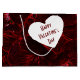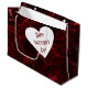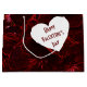 Various shade of red are featured in this design. The design is digital photo of delicate violas. The dark crimson reds and light pink tones come together to give this gift bag a look of neon. On the front and back of the bag there's a white heart with deep red text that reads, "HAPPY VALENTINE'S DAY". This text can be customized with your own text