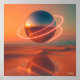A stretch of reflective sand leads to a suspended chrome sphere, traversed by rings of neon light.