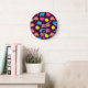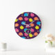 Stylized roses in bright neon pink, blue, yellow, and coral with neon green leaves are spangled across a deep purple background to create a fun floral pattern. Customize the monogram on this clock to make it uniquely your own.