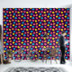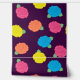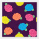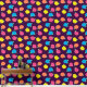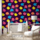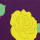 Stylized roses in bright neon pink, blue, yellow, and coral with neon green leaves are spangled across a deep purple background to create a fun floral pattern.