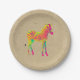 Paper plates with a funky, sixties style psychedelic illustration of a baby zebra in neon colors of bright yellow, hot pink and mint green. Wild and fun with a creative artsy flair. Set on a faux craft paper background.