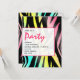 A generic, all purpose party invitation featuring a neon zebra print background on front and back. Personalize the pink and black text on front with details of your occasion.