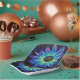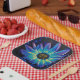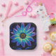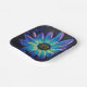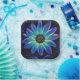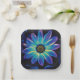 These vibrant paper plates feature a neon flower painting with iridescent blue, teal and purple petals and a glowing yellow center on a deep black background - modern floral art.