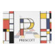 Magnificent, funny, artistic monogram. Here is the letter "P". Neoplasticism style, or De Stijl, line and color artistic decoration, the funny bird sits on the letter. The field of art is located under the letter. Modernist paintings on the left and on the right. The template name "PRESCOTT" is located under the image. Customizable. You can change or delete all the texts, and you can change two images. Unique, one-of-a-kind placemat for a birthday party or another event. Feel free to use the "Edit Design" or "Personalize" (as the case may be) button of the blue color to change the font, color, or position of the template text and images. Be creative, customize, buy one, and be happy!