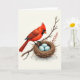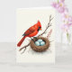 This card features a richly detailed red bird perched on an earthy brown, knotted branch against an off-white background, watching over a nearby nest with a tender, protective focus ❤️. The bird’s crest rises neatly above its head, and its dark eyes angle toward the nest as if keeping close company with what it guards. Its long tail narrows behind it, while dark feet curl gently around the branch in a steady, careful grip. Beside it sits a tightly woven nest made of thin twigs and fibers, tucked close enough to suggest closeness and quiet devotion. Inside the nest are three pale blue eggs with fine darker speckles, adding a soft contrast to the warm reds and browns 🌼. Any greeting appears centered near the top in a muted gray tone, with a smaller line of text placed near the bottom in a lighter matching shade. A slim branch offshoot reaches upward on the right with a few small reddish-brown leaves, and the soft lighting brings out the feather texture and the nest’s braided strands.
