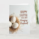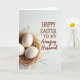 Designed with a soft, diffused glow, this Easter card features a simple white background that lets the natural details take the lead 🌷. In the lower-left area, a small nest of tawny, intertwined twigs sits like a gentle cradle, suggesting the kind of care shared between close friends or partners. Tucked inside are three creamy-white eggs, each marked with fine reddish-brown speckles that feel tender and intimate, like quiet attention to one another. Faint shadows fall beneath the nest and eggs, giving the scene a calm, three-dimensional look without feeling busy. In the upper-right area, the greeting text is placed with plenty of open space around it, keeping the layout airy and balanced 🐇. The lettering is a warm reddish-brown that echoes the twig tones, with the main words in a classic serif style and a more flowing style used for the closing line. The nest’s thin twig lines contrast with the eggs’ smooth curves, and the speckles appear as tiny dots scattered unevenly across each shell.