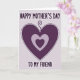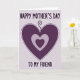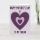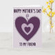 Designed with layered heart shapes in purples and lavenders, this card sits on a pale, lightly textured background that feels soft and calm. A large deep-plum heart takes center stage, edged with a dotted outline that looks gently drawn, like a quiet note passed between close friends ❤️. From the top point of the heart, a curled tendril rises like a ribbon-like flourish, adding a tender, affectionate touch. Inside the main heart, a lighter lavender heart nests neatly, and within that rests a smaller, darker purple heart, creating a cozy, close-in feeling of care. The text “HAPPY MOTHER’S DAY” appears above the hearts in rounded, easy-to-read letters in a matching purple tone. Below the hearts, “TO MY FRIEND” is placed in the same style, keeping the message balanced and clear, with a small 🌼 accent nearby. The central heart is deep plum with a dotted border, and the inner hearts step down in lighter and then deeper purple tones against the pale background.