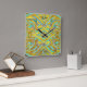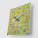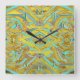 Need more time? This is the clock for you. Numbers are arranged counter-clockwise for people who are forever short on time - or for those who simply would like to turn the clock back to an earlier time. Fun and crazy abstract design in yellow and aqua. Available as a square clock or round.