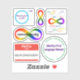 A set of stickers for neurodiverse and neurodivergent people. The designs are: a circle labeled as "neurotypical people" with a dot labeled "me" on the outside, a rainbow infinity symbol to represent neurodiversity, the words "neuro diversity" over a rainbow infinity with each word repeated several times, the word "neurodiversity" over a different rainbow infinity, "Hello I am NEURODIVERGENT" in a nametag style, and "Identity-First Language Please!" with examples of identity-first language in a circle around it.