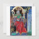 Colorful, vibrant , contemporary painting in gold ,blue,red,green,brown colors . A mysterious hypnotic sorcerer with elegant gorgeous red velvet costumes holding a magic sphere sitting on a gothic throne with gargoyles and an owl. Ambient is surreal,fantastic ,alchemic where you see a jester is drinking from a cup, a templar monk flying on a frog,transparent bubbles,fantasy landscapes with hell fire,cosmic blue sky with stars , mountains of heaven,trees .Egg Tempera on wooden panel with golden foil. 1989 , Miniature Made with pictorical techniques of 1300 by Alessandro Lumini (c) It is also a beautiful fantasy design for Christmas,Holiday,Birthday,New Year's Eve day, Mardi Gras and Carnival greetings.