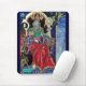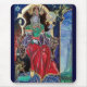 Colorful, vibrant , contemporary painting in gold ,blue,red,green,brown colors . A mysterious hypnotic sorcerer with elegant gorgeous red velvet costumes holding a magic sphere sitting on a gothic throne with gargoyles and an owl. Ambient is surreal,fantastic ,alchemic where you see a jester is drinking from a cup, a templar monk flying on a frog,transparent bubbles,fantasy landscapes with hell fire,cosmic blue sky with stars , mountains of heaven,trees .Egg Tempera on wooden panel with golden foil. 1989 , Miniature Made with pictorical techniques of 1300 by Alessandro Lumini (c) It is also a beautiful fantasy design for Christmas,Holiday,Birthday,New Year's Eve day, Mardi Gras and Carnival greetings.