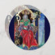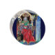 Colorful, vibrant , contemporary painting in gold ,blue,red,green,brown colors . A mysterious hypnotic sorcerer with elegant gorgeous red velvet costumes holding a magic sphere sitting on a gothic throne with gargoyles and an owl. Ambient is surreal,fantastic ,alchemic where you see a jester is drinking from a cup, a templar monk flying on a frog,transparent bubbles,fantasy landscapes with hell fire,cosmic blue sky with stars , mountains of heaven,trees .Egg Tempera on wooden panel with golden foil. 1989 , Miniature Made with pictorical techniques of 1300 by Alessandro Lumini (c) It is also a beautiful fantasy design for Christmas,Holiday,Birthday,New Year's Eve day, Mardi Gras and Carnival greetings.