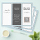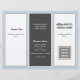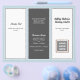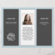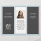 Triple fold business brochure template in dark gray, light blue and white. Customize six sections that include a business logo on the front, QR code and photo template inside. The center panel has a place for a personal photo for the "about" section. Feel free to use the "edit" area to change and / or move fonts, or contact me for help.