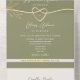 This minimalist olive green all-in-one wedding invitation features a modern leaf line illustration and faux gold string heart detail. With elegant white calligraphy and a matching built-in RSVP section, this design is perfect for couples seeking a natural, stylish, and hassle-free solution—no envelope needed. Personalize with your wedding website and meal options for a streamlined experience.