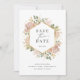 These stunning wedding save the date cards feature a faux gold geometric frame surrounded by lush, watercolor neutral flowers in neutral, earth tone colors such as beige peach, dusty rose, and soft green with gold accents and leaves. An elegant boho floral look on a simple white background. The back of the card features two of your personal photos and room for further text or details.
