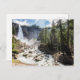 This photo features late winter at Nevada Falls is in full flow and the water thunders off the cliff face and takes up again in the merced river as it passes rocks and fir trees.