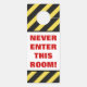 This design features the message "NEVER ENTER THIS ROOM!" in bold red text, along with black and yellow caution stripes.