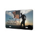 This patriotic front license plate says, "We will never forget their sacrifices." It shows a picture of the silhouette of a young man in the military with his hand on a weathered American flag on top of a mountain. Behind this soldier and this flag is a beautiful sunset. This photograph was taken by my son, David Mann.