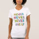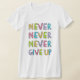 Customizable shirts with motivational slogan - Never, never, never give up - in colorful typography, cartoon style.