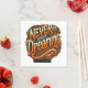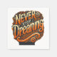 A visually striking, motivational graphic featuring the phrase "Never Stop Dreaming" in bright orange typography. Set against a solid black background, the vibrant colors and ornamental details make the composition energetic and uplifting. This is an artistic and motivational design perfect for t-shirts, mugs, napkins, posters, and merchandise, combining bold fonts and decorative elements to inspire positivity.