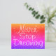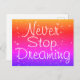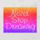 A colorful, positive affirmation to keep you focused on your goals. ‘Never stop dreaming’ is written in a handwriting-style font with a rainbow, star background.