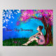 Pretty lady sitting under a pretty pink magical tree whimsical artwork with an inspirational quote.