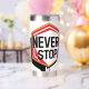 This design features the words 'Never Stop' on a stop sign shape, with retro styling and modern styling alike. The colors are very retro.