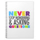 Bright multi color text design reads "Never Stop Wondering and Asking Questions" on inspirational message T-shirts, magnets, buttons, tote bags, cards, stickers, key chains, mousepads, water bottles, and much more. These motivational message items are great for teachers and other educational professionals!