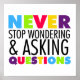 Bright multi color text design reads "Never Stop Wondering and Asking Questions" on inspirational message T-shirts, magnets, buttons, tote bags, cards, stickers, key chains, mousepads, water bottles, and much more. These motivational message items are great for teachers and other educational professionals!