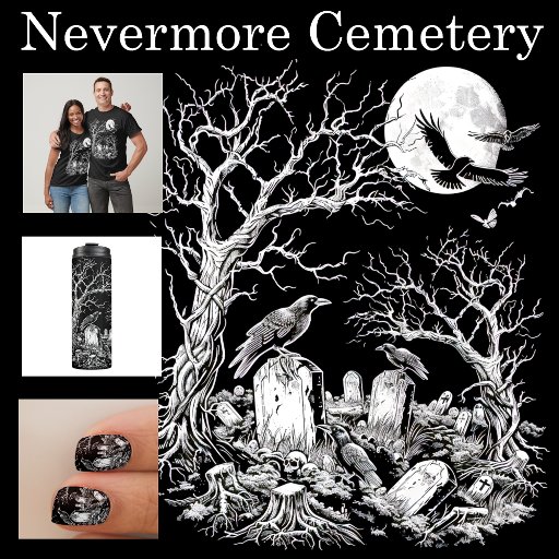 This horror themed design inspired by the famous Edgar Allen Poe poem features ravens roosting on tombstones under the Samhain full moon.