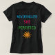 This colorful shirt features a yellow sun and the text: Nevertheless She Persisted. This has become a symbolic battle cry for the courage and integrity of Elizabeth Warren and all women who stand up for what they believe in. Easily personalize or remove the text.