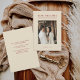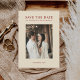 This chic Save the Date announcement features a modern cookbook like feel. The minimalist front has a photo, classic serif text and a creamy beige background. The back of the announcement has space for a formal save the date message.