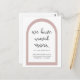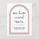 Simple and chic moving announcement with "we have moved" modern script, a pretty gray watercolor botanical branch, trendy pink arch, and new address information.