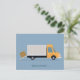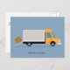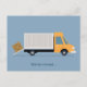 This cute new home change of address postcard features a drawing of a moving truck with a box being loaded onto the back. A simple and fun moving announcement for a family moving to a new house.