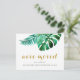Simple and chic tropical palms new address moving announcement features pretty gold color script typography and green watercolor palm leaves with new address information.