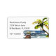 A tropical watercolor palm tree leans out over the water on this southern/Florida themed change of address label. The scene also includes a wooden dock, typical of homes on intracoastal waterways. Text is customizable for your personal greeting and contact details.