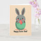 This card shows a plump gray long-eared bunny 🐰 with wide, shining eyes and rosy cheeks, peeking out from a cracked mint-green eggshell on a soft peachy beige background. The bunny’s small smile and gentle tilt of its head give it a friendly, affectionate look, as if it’s sharing a private joke with someone close. In its paws, it holds a smaller deep red egg decorated with neat white polka dots and stripes, adding a sweet, gift-like touch. The large shell has thin white crack lines around the opening, suggesting a fresh hatch and a cozy, just-arrived moment. Beneath the illustration, a short Easter greeting sits centered in a simple, easy-to-read style, colored to match the soft palette and not distract from the characters. The spacing leaves plenty of breathing room around the text, keeping the focus on the bunny and the eggs. A few subtle shadows under the shell and along the bunny’s ears add depth, while a tiny 🌷 accent can be worked in near the lower edge. The mint-green shell curves upward with jagged edges, framing the bunny as it hugs the patterned red egg.